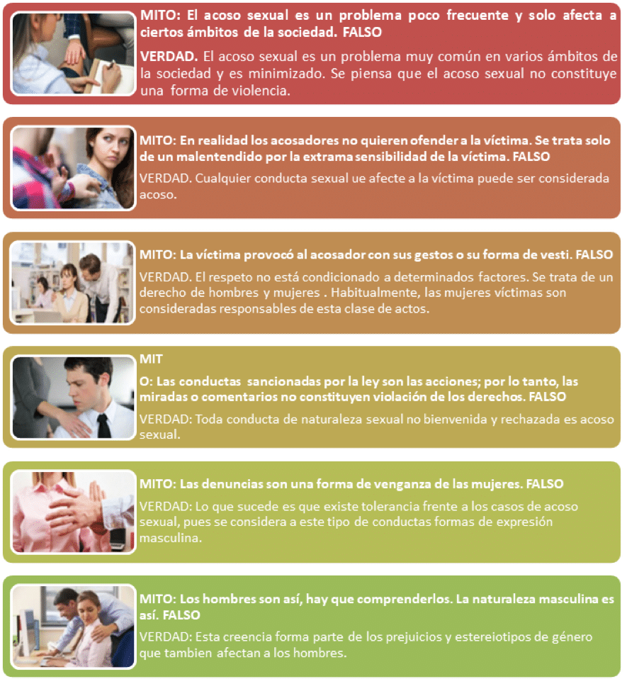 Actualmente existen mitos que impiden que el acoso sexual sea identificado plenamente. Esto es a consecuencia de que en nuestra sociedad hay estereotipos, que son resultado de una visión de las mujeres víctimas como objetos sexuales y las relaciones desiguales entre hombres y mujeres.