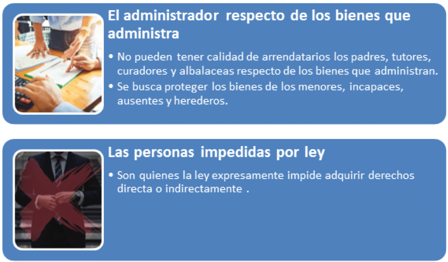 Algunas personas están impedidas de tomar en arrendamiento determinados bienes en función a la relación que tienen con los mismos, los cuales son los siguientes: