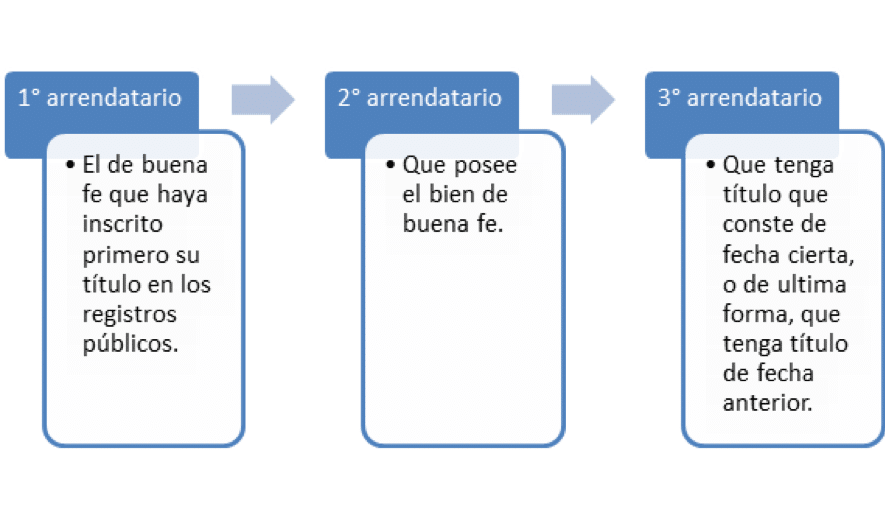Cuando se arrienda un mismo bien a dos o más personas, se prefiere al arrendatario de buena fe cuyo título ha sido primeramente inscrito o, en defecto de inscripción, al que ha empezado a poseerlo; pero, si ninguno ha empezado a poseerlo, será preferido el arrendatario cuyo título sea de fecha anterior, salvo que el de alguno conste de documento de fecha cierta.
