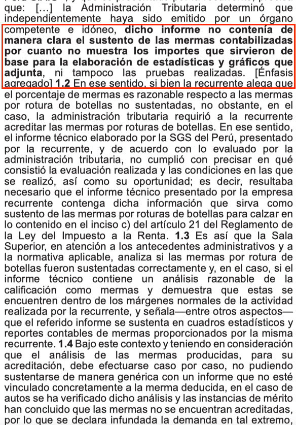 Asimismo, corresponde analizar caso por caso la acreditación de las mermas. En el caso de autos, se requería acreditar las mermas de roturas de botellas a través de un informe técnico que contenga la información respecto a las pruebas y metodología realizada.