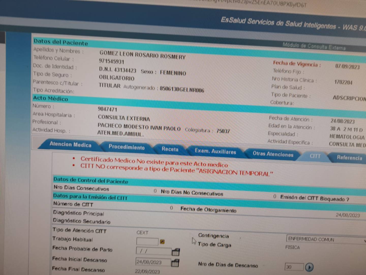 Buenas tardes, estimado Miguel, es caso de un trabajador que esta internado en el hospital almenara desde el 15 de julio a la fecha, solo nos a entregado el CITT por 1 dia y el familiar nos indica que el Medico no puede entregar el CITT porque el sistema no le deja emitir el CITT, el sistema le sale un anuncio (adjunto detalle), agradeceré su respuesta, no sin antes agradecer su valioso aporte a nuestra profesión.