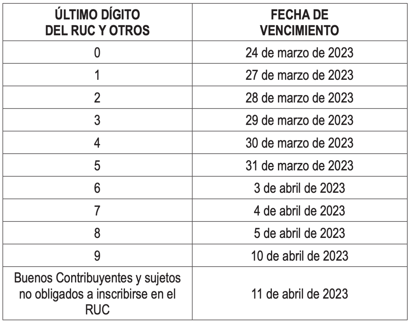 Por el ejercicio gravable 2022, los deudores tributarios presentan la Declaración y, de corresponder, efectúan el pago de regularización del Impuesto y del ITF, de acuerdo con el siguiente cronograma:
