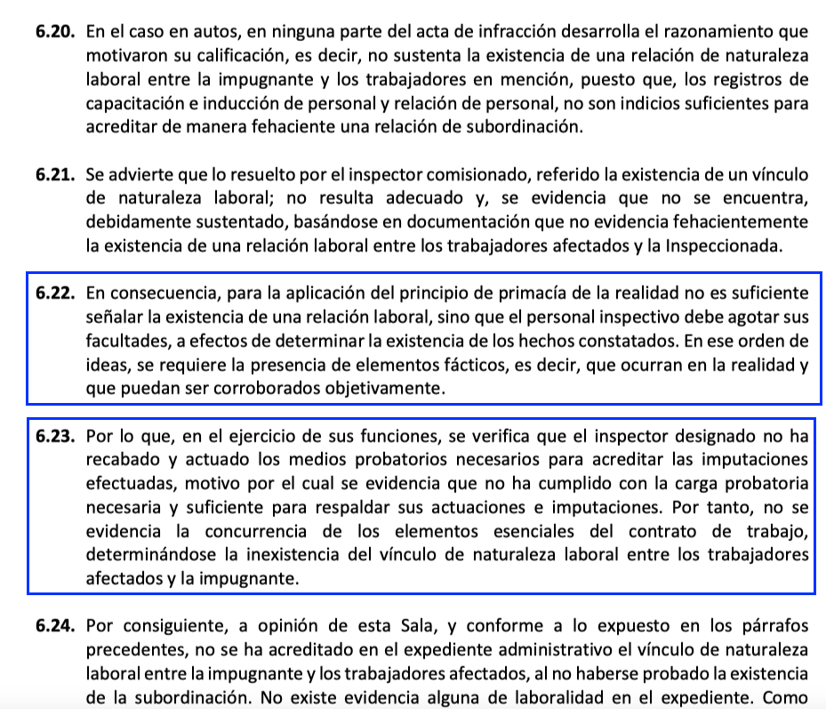La aplicación del principio de primacía de la realidad no es suficiente señalar la existencia de una relación laboral, sino que el personal inspectivo debe agotar sus facultades, a efectos de determinar la existencia de los hechos constatados.