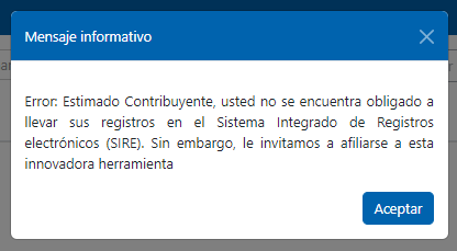 “Error: Estimado contribuyente, usted no se encuentra obligado a llevar sus registros en el Sistema Integrado de Registros Electrónicos (SIRE). Sin embargo, le invitamos a afiliarse a esta innovadora herramienta”, tal como se observa en la siguiente imagen: