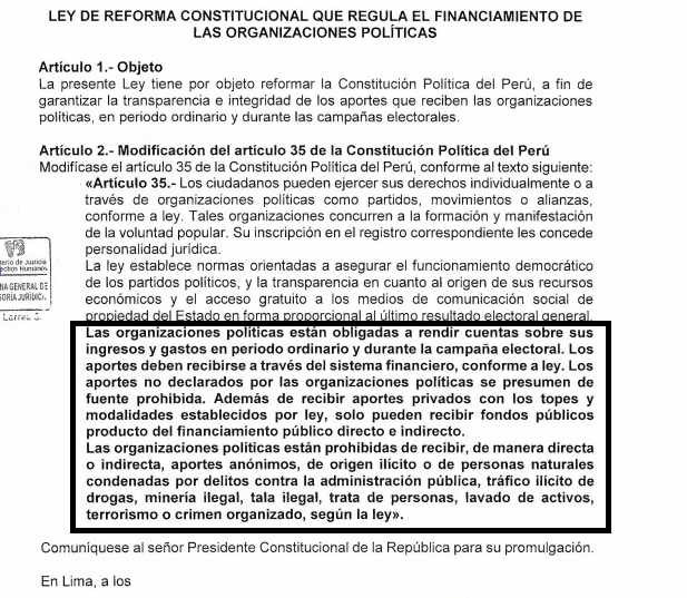- Proyecto de Ley de Reforma Constitucional que regula el financiamiento de las Organizaciones Políticas.