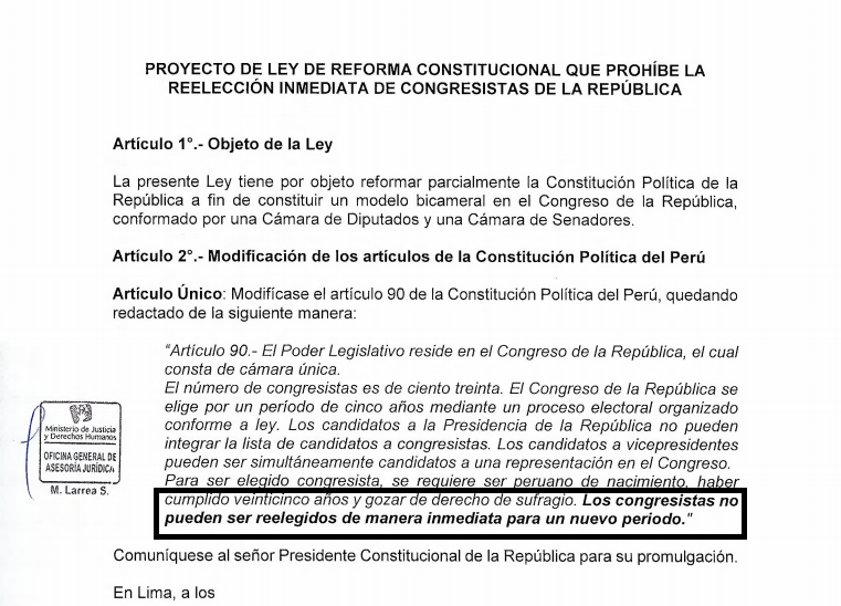 - Proyecto de Ley de Reforma Constitucional que prohíbe la reelección inmediata de congresistas de la República.